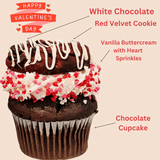 Treat your loved ones to something special with our delightful V-Day Cookie Cupcakes! These charming cupcakes, perfect for Valentine's Day, are crafted with rich chocolate cake, sprinkled with heart-shaped decorations, and crowned with a mouthwatering red velvet cookie. Spread the joy and make this Valentine's Day truly memorable with our irresistible goodies.